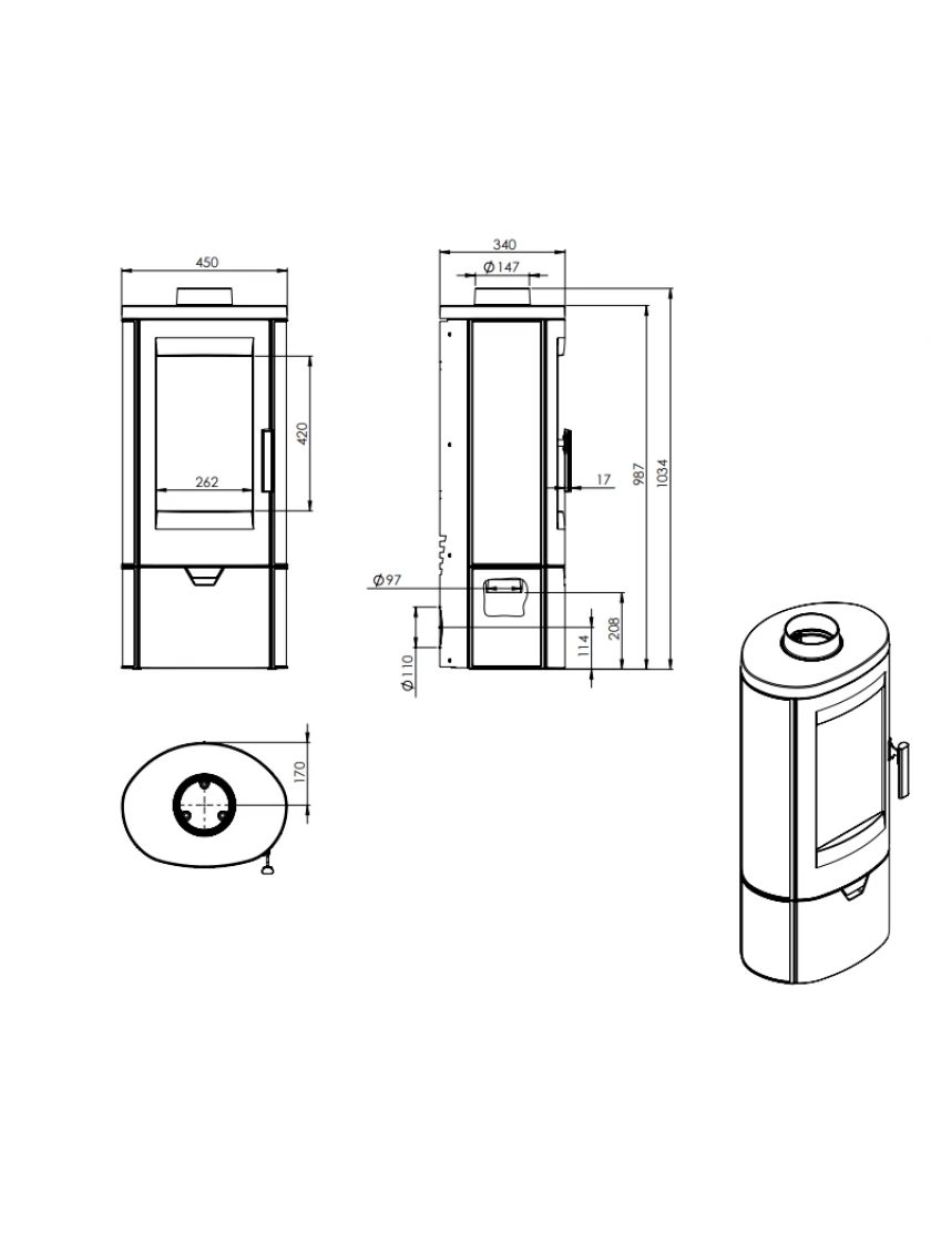 Для зручності експлуатації піч оснащена зольником, обмежувачем дров та дефлектором. Підключення димоходу — верхнє, під трубу Ø150 мм.